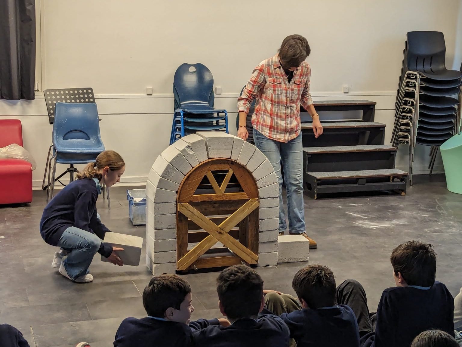 Après avoir aiguisé leur sens de l’observation pour apprendre à reconnaître l’architecture romane et gothique, les élèves se livrent à quelques expérimentations géométriques et physiques pour découvrir les méthodes de construction médiévales. Le point culminant de l’atelier étant la réalisation d’une grande arche romane.
