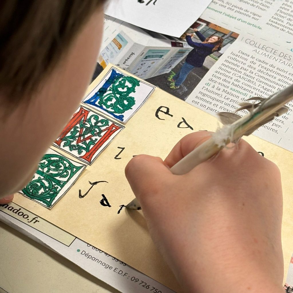« Comment est-on passé du latin au français ? » Après avoir survolé 1000 ans d’histoire médiévale au travers du prisme de la langue et de l’écriture, les enfants tentent à leur tour de réaliser une enluminure en se servant de véritables plumes d’oies !