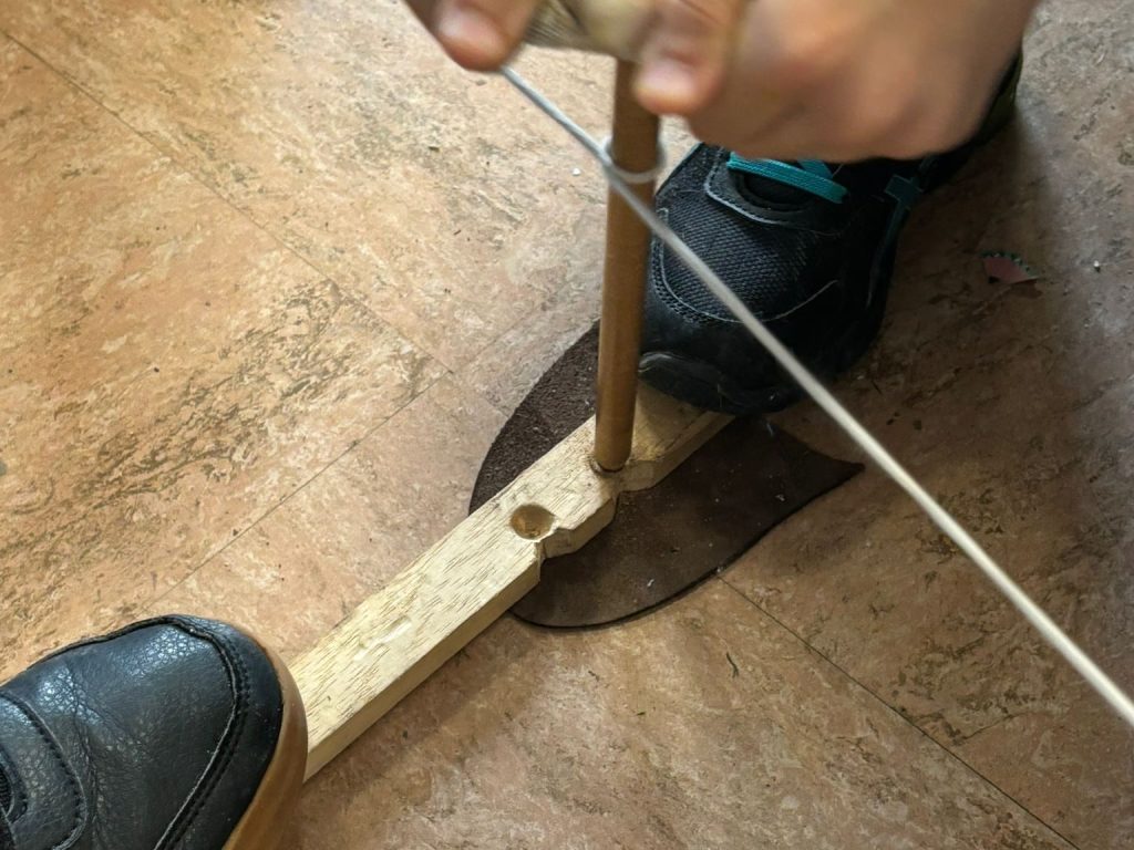 L’atelier commence par une démonstration d’allumage de feu par percussion, puis c’est aux élèves d’expérimenter à leur tour pour tenter de réussir un allumage de feu par friction.