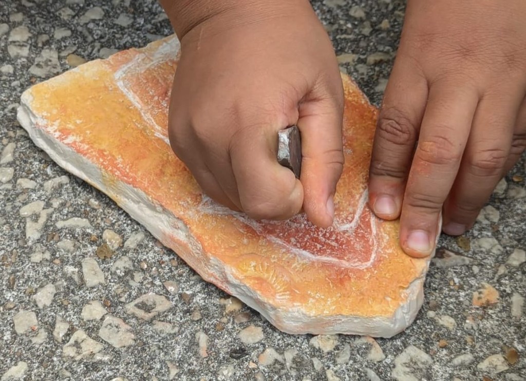 L’atelier commence par une démonstration d’allumage de feu par percussion, puis c’est aux élèves d’expérimenter à leur tour pour tenter de réussir un allumage de feu par friction.