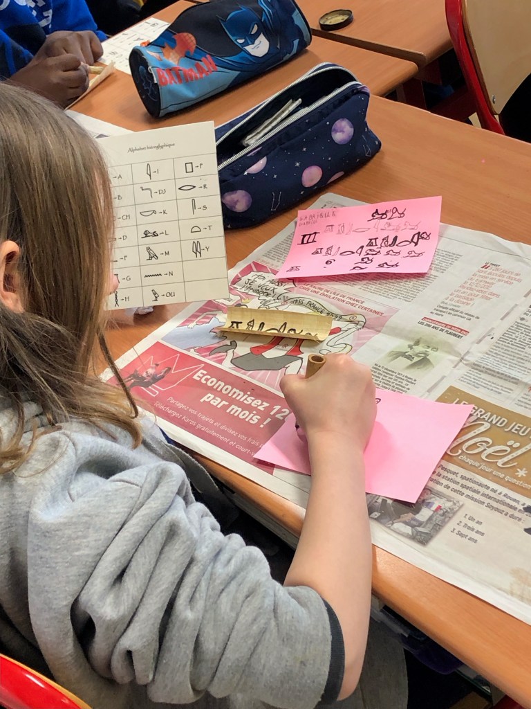 Après une introduction à l’Egypte antique et à son système d’écriture, les élèves se familiarisent à plusieurs activités autour des hiéroglyphes : reconnaître, compter, déchiffrer. L’atelier se termine par l’écriture en hiéroglyphes du prénom de l’enfant sur du papyrus à l’aide d’un calame en roseau. Ils pourront repartir avec leur réalisation.