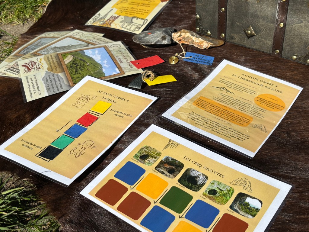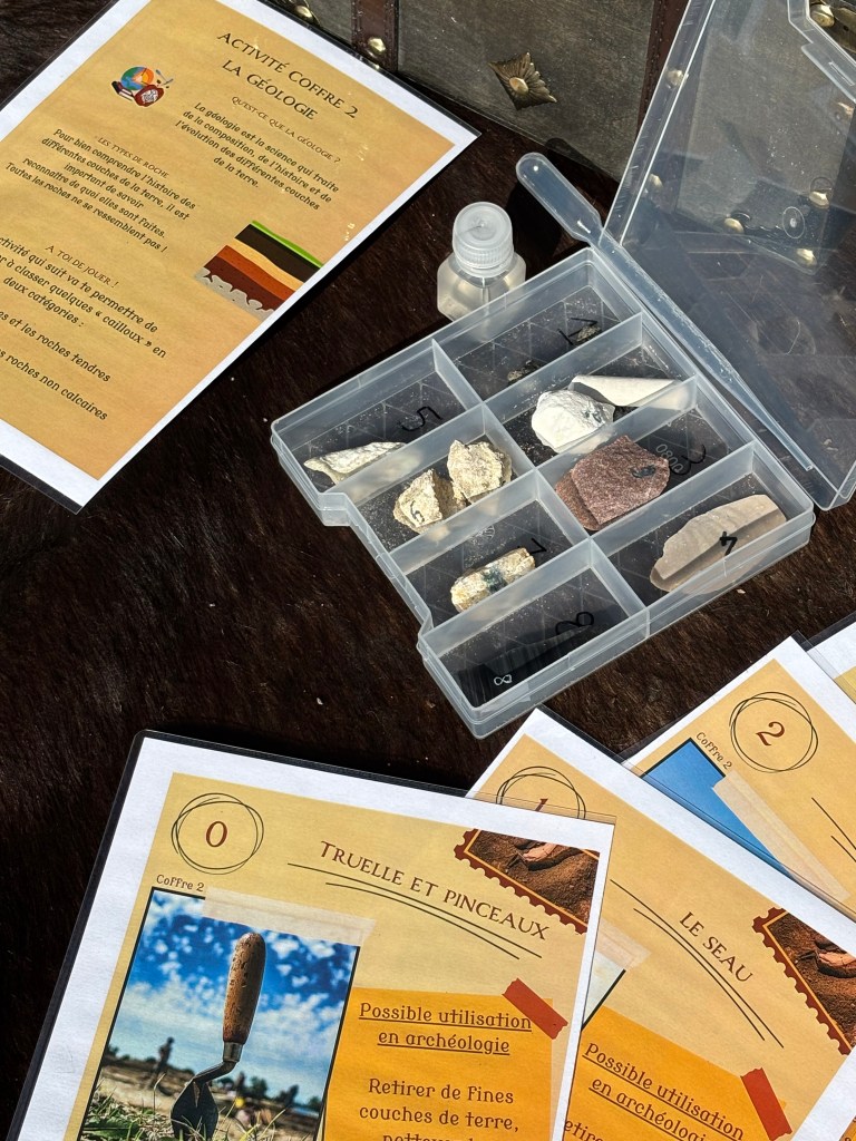 Cette malle contient de quoi découvrir l’archéologie de manière autonome. Les élèves suivrons une chasse au trésor avec des activités sur le thème de l’archéologie (traduction hiéroglyphes, numismatique, classification géologique,…).