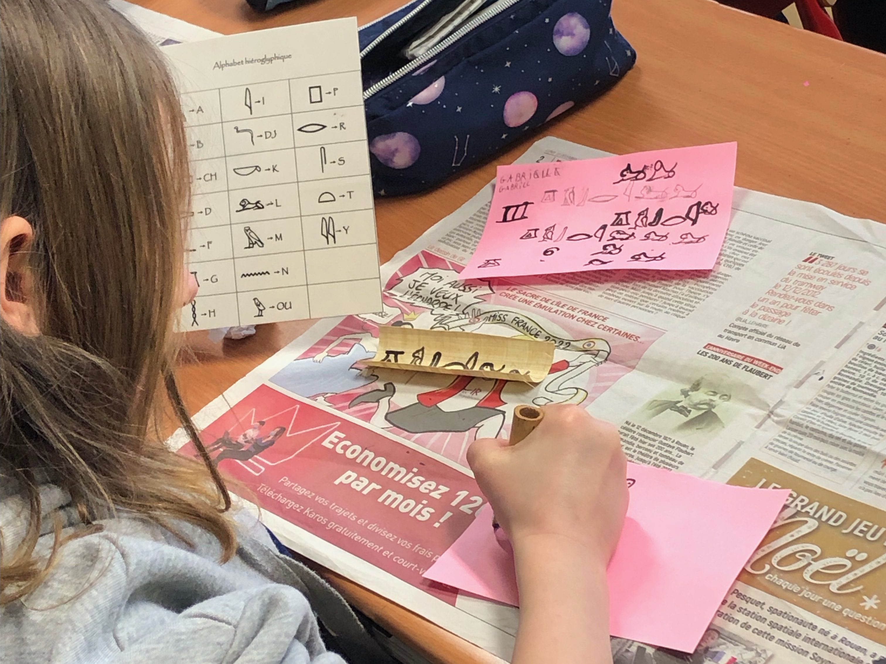 Après une introduction à l’Egypte antique et à son système d’écriture, les élèves se familiarisent à plusieurs activités autour des hiéroglyphes : reconnaître, compter, déchiffrer. L’atelier se termine par l’écriture en hiéroglyphes du prénom de l’enfant sur du papyrus à l’aide d’un calame en roseau. Ils pourront repartir avec leur réalisation.