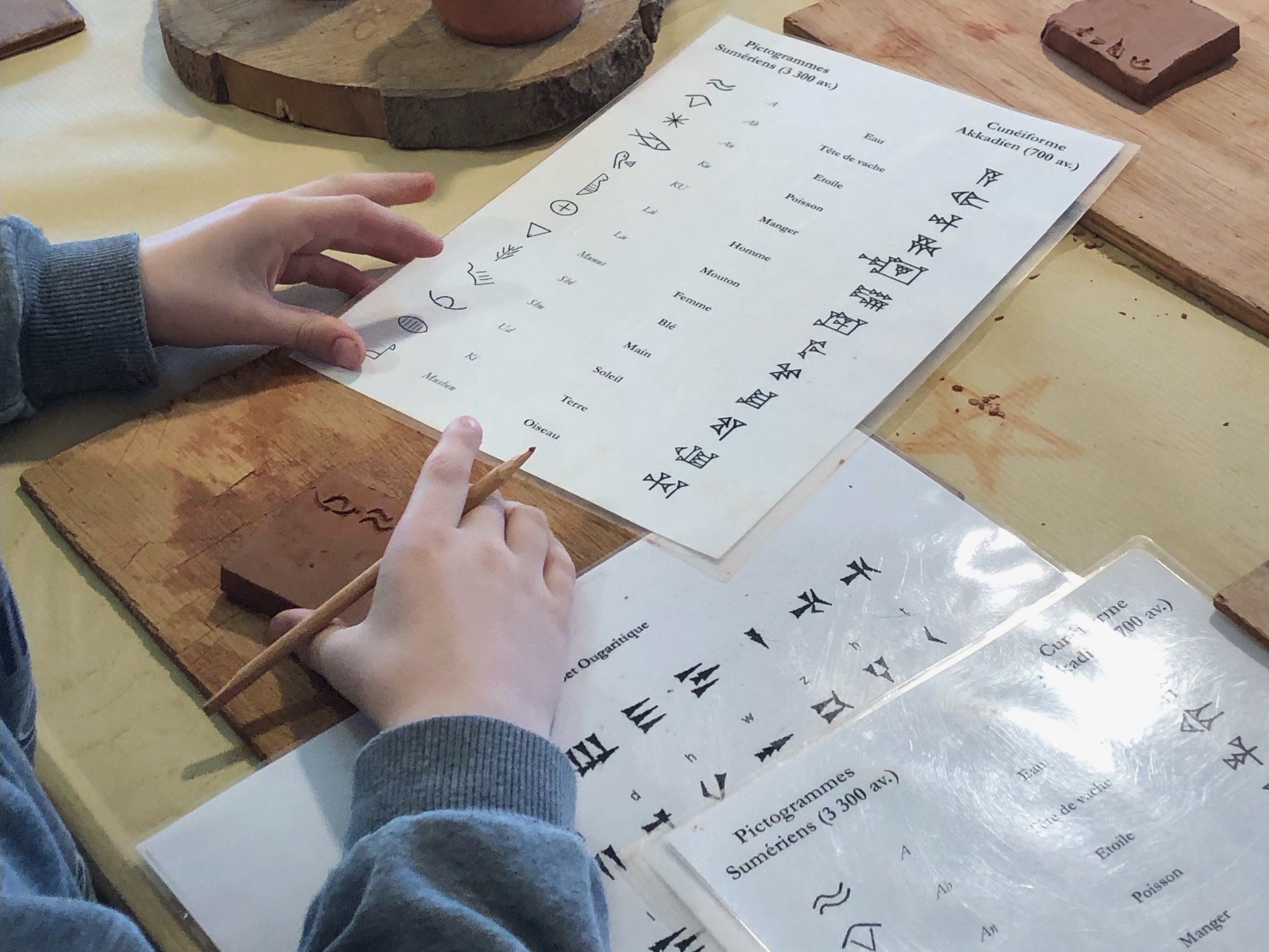Après s’être demandé « Pourquoi et comment écrire ? », les élèves s’initient à l’écriture cunéiforme, aux pictogrammes et aux premières techniques de calculs sur une tablette d’argile avec laquelle ils repartiront.