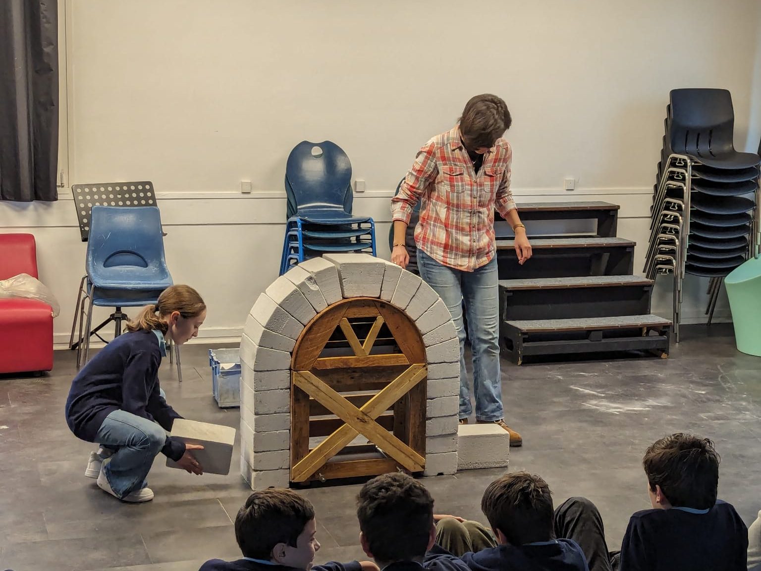 Après avoir aiguisé leur sens de l’observation pour apprendre à reconnaître l’architecture romane et gothique, les élèves se livrent à quelques expérimentations géométriques et physiques pour découvrir les méthodes de construction médiévales. Le point culminant de l’atelier étant la réalisation d’une grande arche romane.