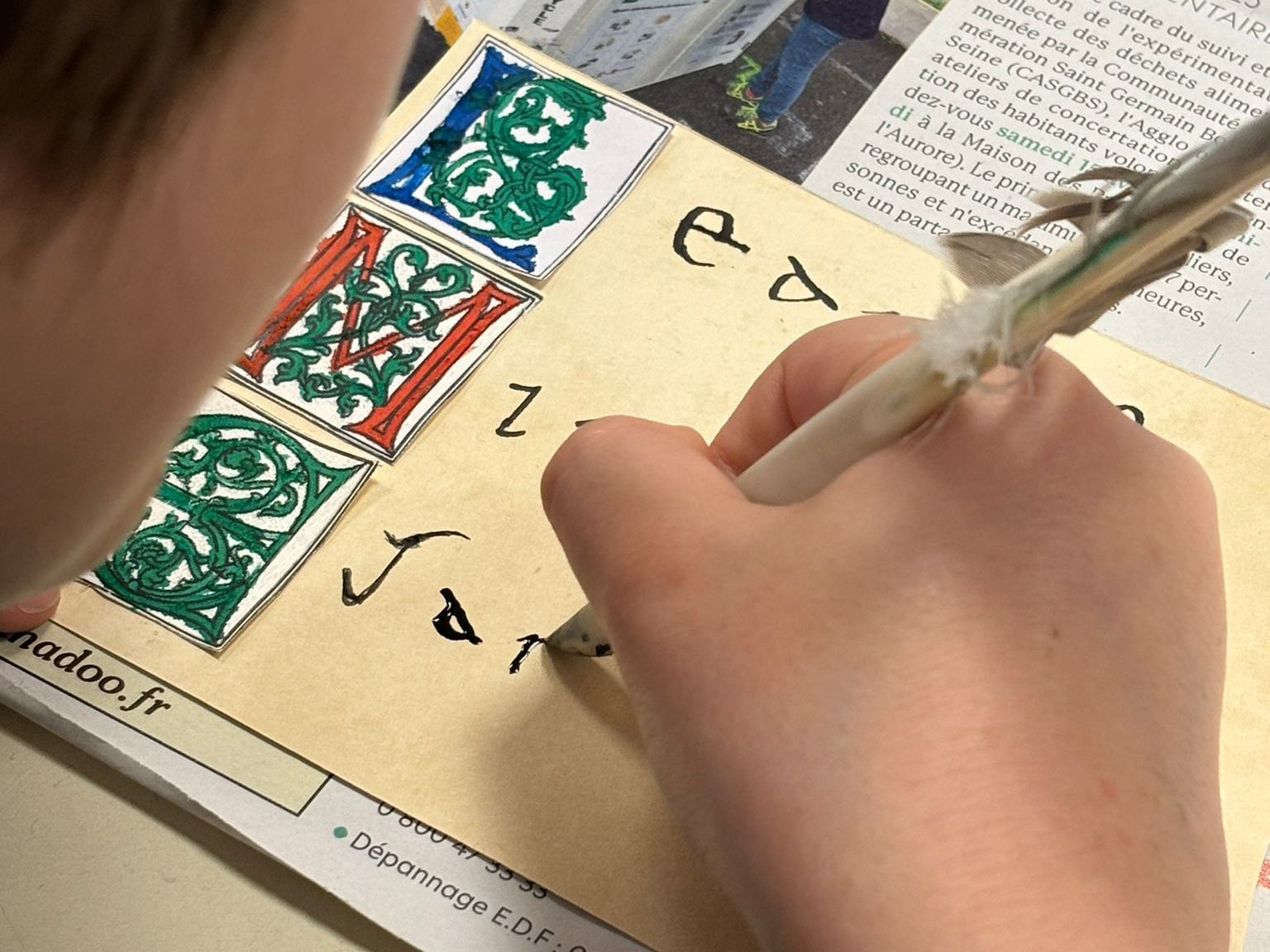 « Comment est-on passé du latin au français ? » Après avoir survolé 1000 ans d’histoire médiévale au travers du prisme de la langue et de l’écriture, les enfants tentent à leur tour de réaliser une enluminure en se servant de véritables plumes d’oies !